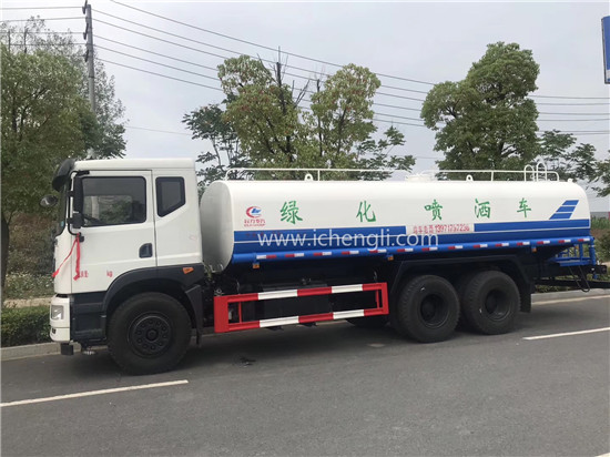 根據客戶要求:罐體容積約20立方;專用功能為:前沖后灑,帶側噴,帶高位花灑,罐體后帶工作平臺,平臺上安裝綠化灑水高炮,灑水炮可全方位旋轉,并有多種雨狀可調節(大雨、中雨、毛毛雨、霧狀),泵可自吸自排,帶自流閥,帶消防接頭,帶過濾裝置。
