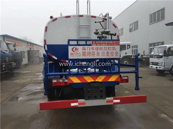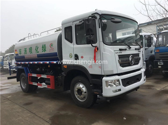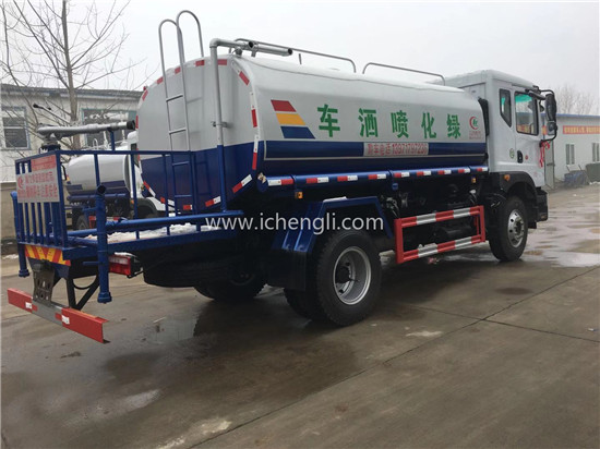 根據客戶要求:罐體容積約12立方;專用功能為:前沖后灑,帶側噴,帶高位花灑,罐體后帶工作平臺,平臺上安裝綠化灑水高炮,灑水炮可全方位旋轉,并有多種雨狀可調節(大雨、中雨、毛毛雨、霧狀),泵可自吸自排,帶自流閥,帶消防接頭,帶過濾裝置。