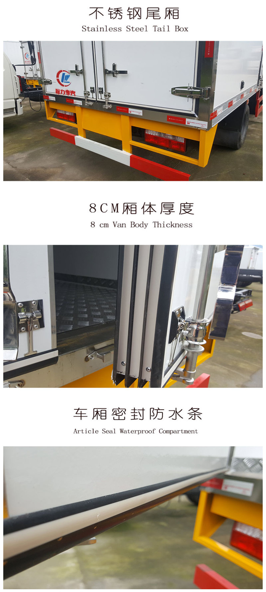 七 廂體配置:我公司冷藏車廂體采用液壓吸附一體成型生產線制造,保溫性能達到國家A級標準。廂體內面料采用最新款納米玻璃鋼(不吸光、隔熱性好、硬度強、抗氧化),保溫材料為8cm高密度聚氨酯保溫層,全密封樹脂膠粘接。廂體框架為防銹處理槽鋼支撐,廂體四周采用鋁合金型材包邊,不銹鋼包角。廂體內部加裝LED夜間照明燈,四角加裝LED式寬度。配后雙開門(不銹鋼包邊、不銹鋼鎖件合頁),(側門選裝)尾部加裝防撞膠塊,采用三元乙丙橡膠密封條,3M反光膠板!