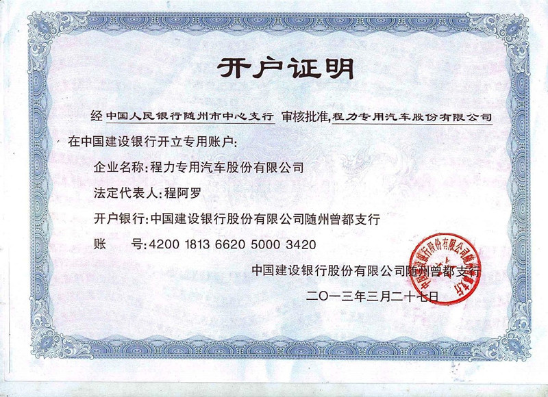 程力專用汽車股份有限公司是全國大型的灑水車,冷藏車、垃圾車,掃路車、清洗吸污車、消防車等生產廠家基地,客戶購車可以通過傳真或者掃描件與我公司銷售人員簽訂合同,按照我公司的打款信息來付訂金與尾款,現將程力公司開戶信息公布如下: