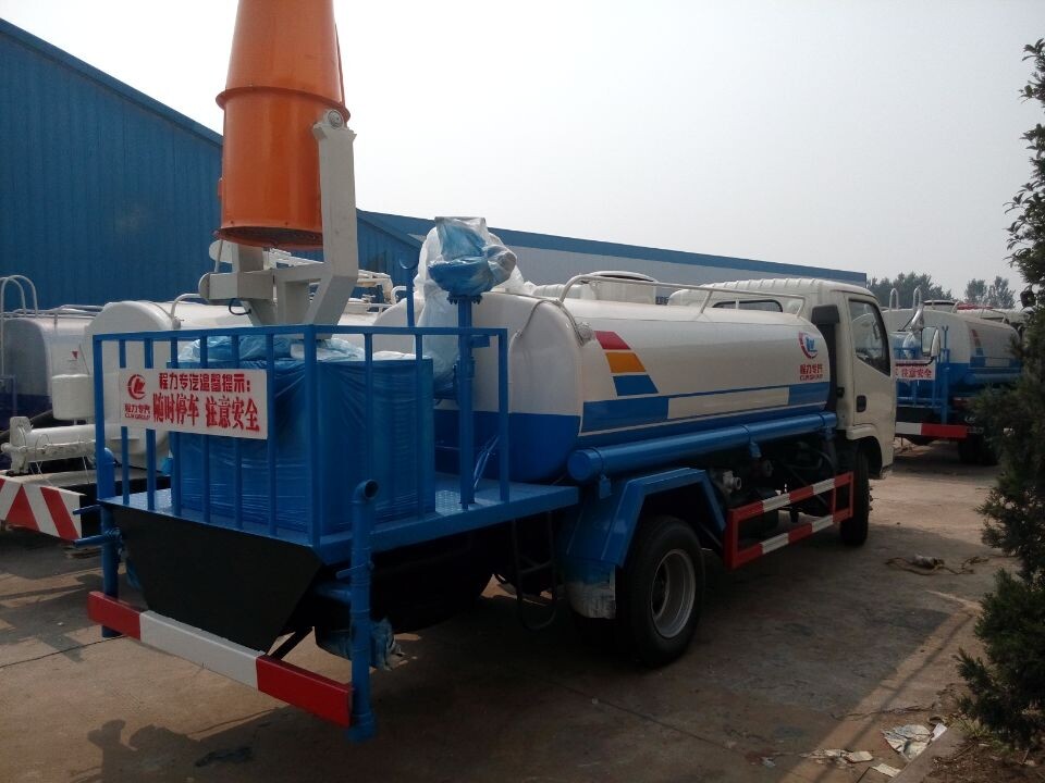 東風5噸農藥噴灑車標配:前沖、后灑、側噴、消防接口、后360度旋高位灑水炮,可作灑水車使用,罐體后帶工作平臺,工作平臺上加裝柴油發(fā)電機組,三相交流同步發(fā)電機、三相異步電動機、三缸活塞泵,并安裝風機炮筒,由柴油發(fā)電機為農藥噴灑設備提供專一動力來源功力強、風量大、射程遠、覆蓋范圍廣,霧粒細小、可以實現(xiàn)精量噴霧。東風5噸農藥噴灑車帶直徑45cm打藥炮筒,可上下-10~40度、左右320度旋轉,農藥噴灑水平射程可達30m以上,寬度可達7米左右,噴灑農藥呈霧狀,噴出的氣流能很有效地翻動植物葉片,使其正反面受藥,且對物體有較強的穿透力和藥液附著力、能有效地節(jié)約藥量和減少污染,工作效率高。