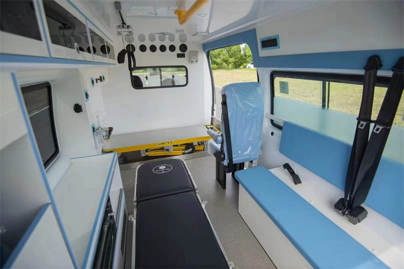新時代全順V348短軸救護車,艙內配有定向排風系統。后門上車照明燈,夜間工作也很利于。鏟式擔架安裝在后門左內側(或在柜式床內存放)。醫療艙左側藥品、器械儲物柜。兩側白色照明燈。救護車整體都配備的有電路控制系統及保護。前部設置的有小醫療柜。