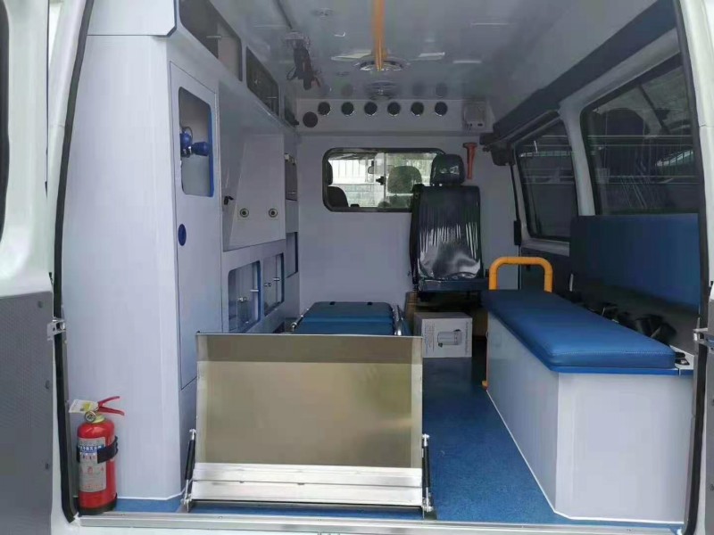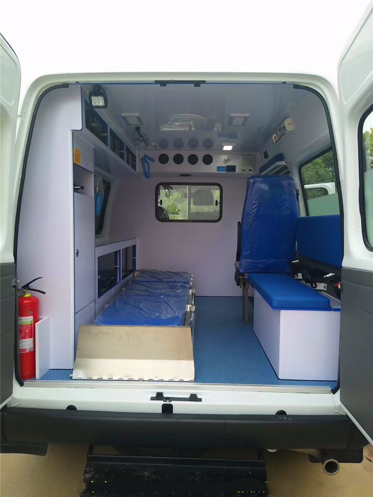 江鈴特順轉運型救護車上裝配置:救護車醫療艙的大小,直接跟醫療艙需要配置的儀器有關。選擇配備配置:異型警燈,尾翼警燈,邊燈,定制外部外表,擔架底座臺(可放鏟式擔架)。前后對講機1個, 醫療地板。醫療地板。