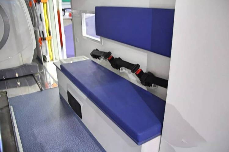 依維柯移動5G腦卒中負(fù)壓救護車,醫(yī)療艙右側(cè)安裝單人標(biāo)準(zhǔn)座椅 1 張(配三點式安全帶),左側(cè)安裝長條標(biāo)準(zhǔn)座椅 1 張(配二點式安全帶)。醫(yī)療艙內(nèi)配置暖氣系統(tǒng)。供養(yǎng)/呼吸:氧氣瓶、氧氣袋、呼吸面具、牽引裝置。醫(yī)用污物桶是腳踏式的。醫(yī)療艙頂部安裝隱藏式輸液瓶懸吊裝置。