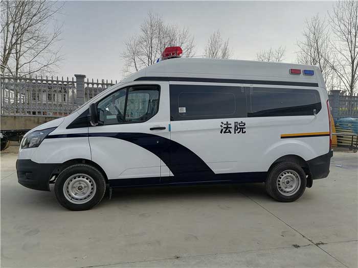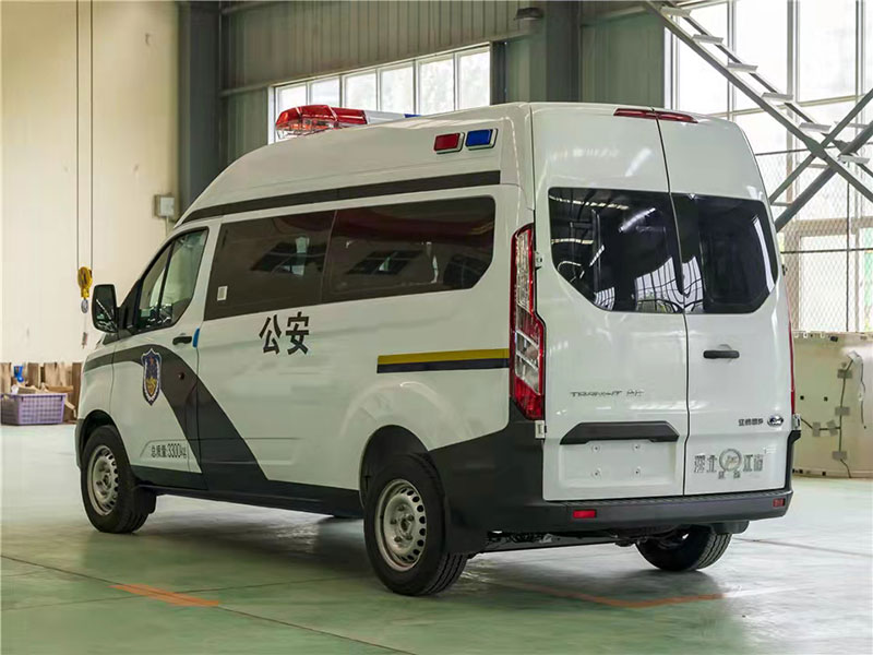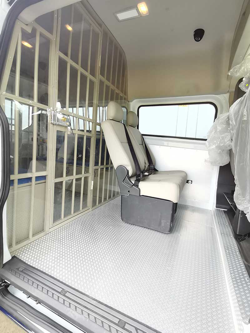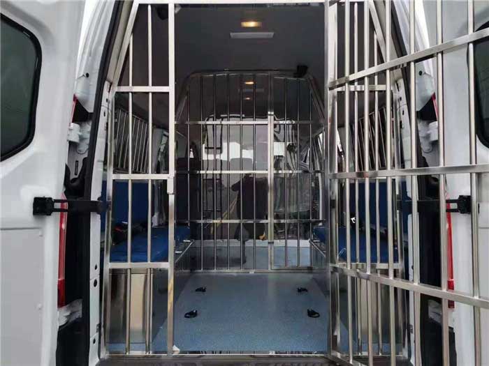 警用囚車_福特新全順V362囚車,后艙囚籠。為相關部門的安全工作給出非常有力的確保。系統應用攝像機能對車內辦公區、車身周邊、囚室區進行全方位監控。車上設備可對攝像資料進行實時顯示、存貯。整車涂裝,耐腐蝕性強。通過配備的無線車載終端與總部指揮中心進行及時數據傳送和在線指令傳達,更加的人性化與智能化。