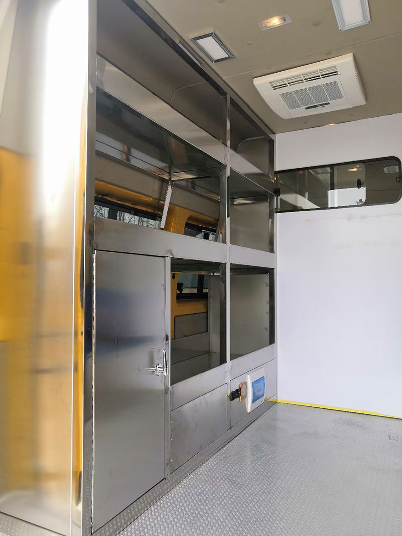 5-9人座工程搶修車_福特V348礦山應急氣防車工程搶修車上裝配置:礦山應急氣防車的總體結構為駕駛室和艙體、車體。前頂安裝警燈凸臺、長排爆閃警燈,左右兩側頂藍色方形LED警燈和白色方形LED警燈,藍白警燈成對排列,尾門頂部安裝藍色爆閃燈能夠有效警示。艙體右側折疊椅的左側設有器材骨架Ⅱ,器材骨架Ⅱ后側配備滅火器。座椅包裹性強,用料也挺扎實的,坐起來很舒服。長排燈、外場照明燈、設備天線、爆閃燈安裝在車的頂部。外層鋪蓋一層阻燃金屬布,防火性更好,不便于氧化,內飾應用1.2mm厚網孔板。有助于提高發動機的冷卻條件和汽車行駛穩定性,車輛內部具有極佳的通風。