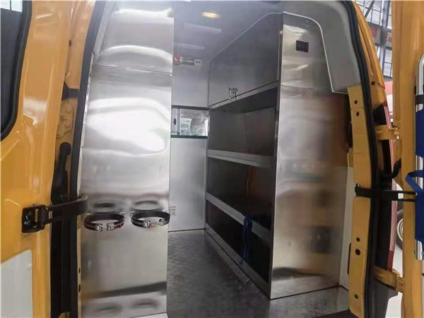 福特V362_4-7人座搶險救援車上裝配置:車輛應(yīng)用堅固的硼鋼鑄造、多支橫梁結(jié)構(gòu)設(shè)計,硼鋼的淬透性非常高,具備高耐磨性和不差的抗疲勞性,是軍工行業(yè)、航空航天工業(yè)和潛艇制造的主要鋼材。能個性化定制的內(nèi)飾,更能滿足用戶需求。所述車體的上端設(shè)有長排燈、外場照明燈、設(shè)備天線、通過玻璃鋼底座固定的爆閃燈。數(shù)碼變頻的發(fā)動機組。外部鋼材為優(yōu)質(zhì)冷軋鋼板,表面處理平整,內(nèi)襯優(yōu)質(zhì)冷軋鋼板折彎骨架,強度牢固,配重合理。車頂設(shè)備盡量應(yīng)用與車頂工作平臺相連而不與車頂直接相連,避免設(shè)備的維護、檢修影響車的密封性。廂體選擇靜音降噪材質(zhì)。一體式搶險裝備工具運輸功能。