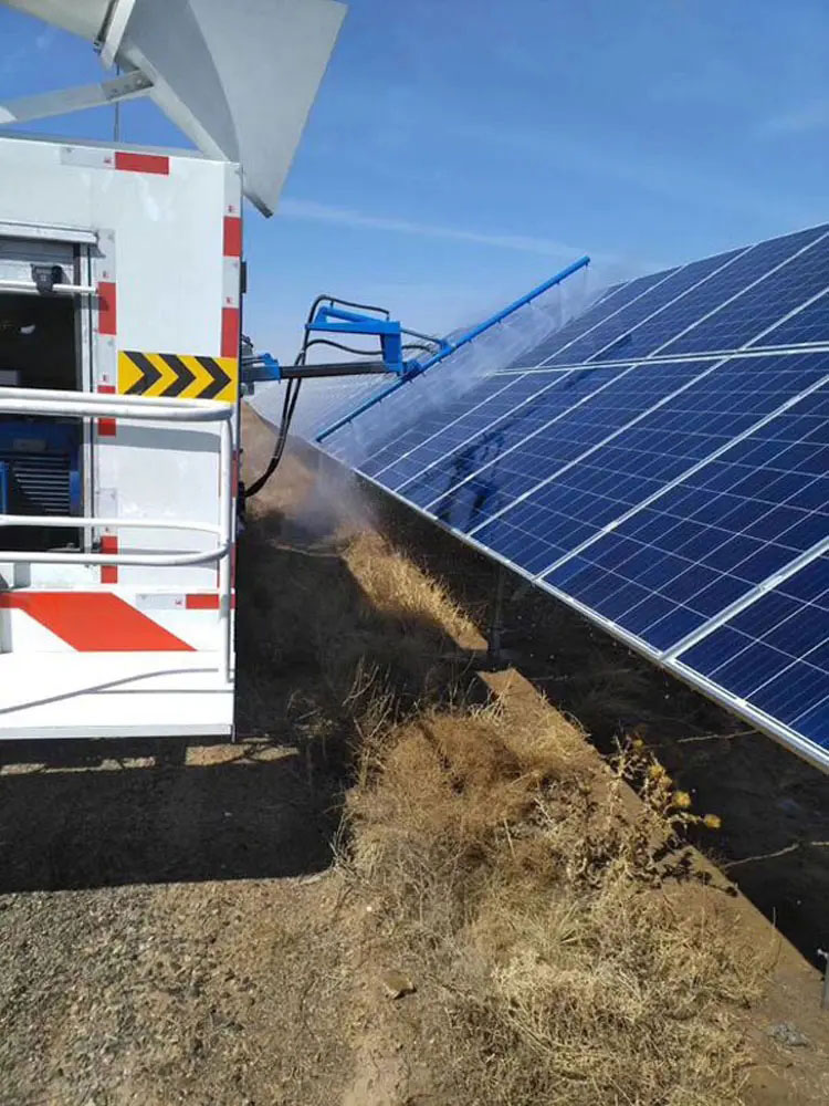 多利卡D9_8方太陽能光伏清洗車高壓清洗車,它每小時能夠清潔8-10公里的光伏板。一車多用,不光可以清洗太陽能光伏板,還可以清洗隧道里面墻壁上的灰塵。這款車維護(hù)成本低、工作效率高、節(jié)能降耗等優(yōu)點,深受用戶喜愛。進(jìn)水系統(tǒng)有自動電加熱系統(tǒng),水箱有保溫加熱功能,升降臂可360度旋轉(zhuǎn)。配備的有能伸縮的自動感應(yīng)裝置,如果遇到光伏板不平的時候,也能良好的完成清洗工作。安裝的知名高壓水泵,在提高工作效率的同時,還能夠節(jié)約用水,同樣體積的水的工作時間更長。