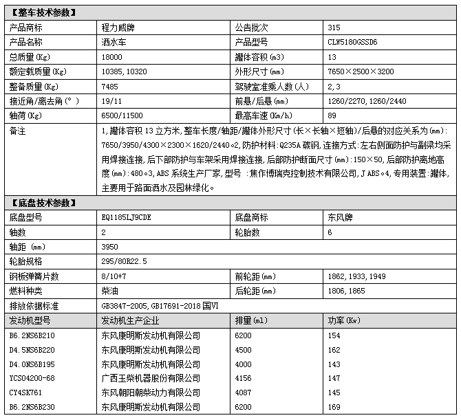 底盤配置:采用東風(fēng)D9系列新款駕駛室,3950mm軸距,搭載國六(國Ⅵ)玉柴200馬力柴油發(fā)動機(jī)/康明斯210匹馬力柴油發(fā)動機(jī),6檔變速箱,9T后橋,295真空胎,方向助力、斷氣剎、電動窗、中控鎖、ABS,原裝空調(diào),GB7258新規(guī)。