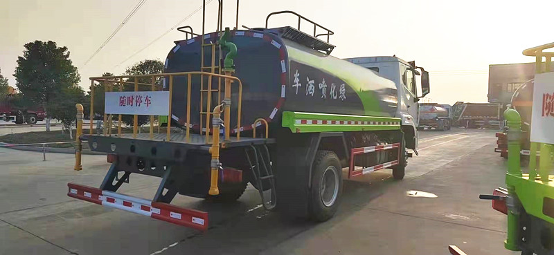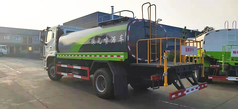 專用配置:罐體容積:15 立方,罐體鋼板為4mm碳鋼Q235材質專用容積板一次成型,罐內隔板具有防波作用,以減輕汽車行駛時罐體液體沖擊;配大功率專用灑水泵,泵可自吸自排;整車前沖、后灑、側噴、后平臺帶綠化灑水炮,灑水炮可全方位旋轉,可連續調成直沖狀、大雨、小雨、毛毛雨;前封頭帶水位計,后平臺主管路帶1寸澆花接口,后爬梯,帶1個消防接頭,帶1個自流閥,1個過濾裝置。