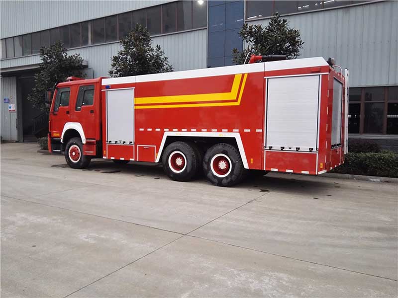16方水罐消防車_重汽豪沃后雙橋水罐消防車,我廠具有國內的烘干設備,嚴格做到油漆噴刷工作時防塵,無污染。動力強大,設計布局人性合理,環保節能。泵房和器材箱左右兩側安裝有新款鋁合金卷簾門,開啟易于,強度高。罐體優質碳鋼材料(Q235A),焊接式結構,內設縱,橫防蕩板,經環氧防腐處理。可應用304不銹鋼及PP材料。為了更準確對準著火點滅火,爬梯可以輔助消防員上到箱體頂部操作消防水炮。