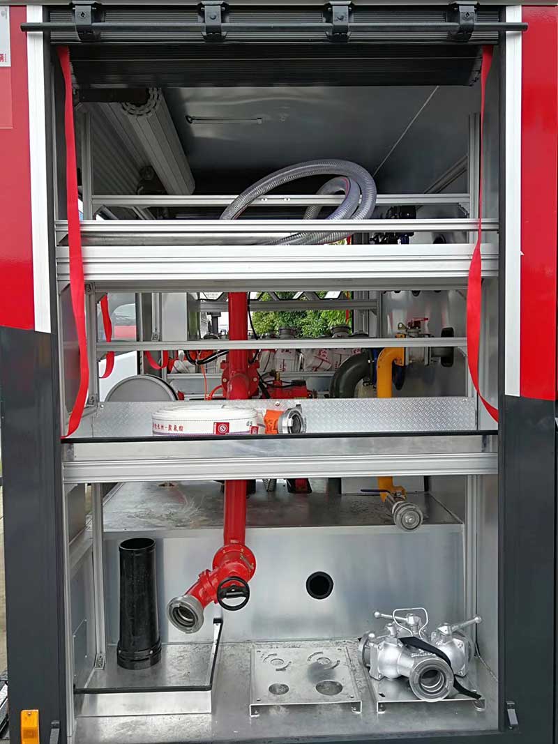 5方水罐消防車_東風多利卡D7雙排水罐消防車,車輛尾部安裝可折疊式爬梯。器材箱使用引進歐洲技術生產的鋁合金型材內藏式塔接技術制造,全卯接結構。全車兩側上方各配有2個紅藍爆閃燈及2個側照明燈。載液罐體為優質碳鋼,與底盤選取彈性連接。器材箱內設置有儲物盒,可以放置一些小型工具。駕乘室后部設置的器材箱安裝有鋁合金卷簾門,內設有照明,物品拿取利于。