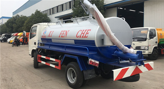 上裝配置:罐體容積5立方,專用部分由取力器、傳動軸、真空吸糞泵、水氣分離器、油氣分離器、多路換向閥、吊桿、糞罐、放糞閥、清水箱、視糞窗、真空壓力表、管網系統等組成。