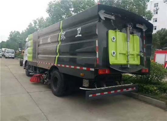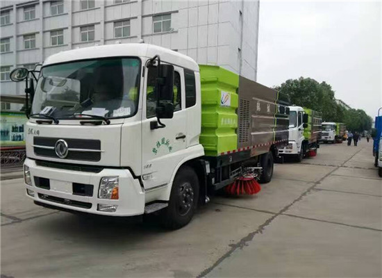 洗掃:清掃作業裝置工作的同時,副發動機驅動配有專用離合器的高壓水泵參與工作。高壓水泵將來自清水箱的清潔水加壓后通過高壓管路控制閥等分別輸送到吸嘴內噴水桿和左、右噴水桿,各噴桿上裝有多個特制的不銹鋼扇形噴嘴,扇形噴嘴噴出的扇形水簾組成一總寬不小于3.5m的U形水刀,直接沖洗路面,沖洗路面后的水被吸回到垃圾箱中,實現路面洗掃。路沿和路沿石立面洗刷:利用掃盤的左或右立掃,左或右噴桿上的路沿石清洗噴嘴,選用左或右洗掃作業模式進行洗掃作業,就可對左或右路沿與路沿石立面進行洗刷作業。后噴霧:在洗掃車后部垃圾箱下方配有噴霧噴桿,噴霧噴桿上裝有多個噴霧噴嘴。啟動副發動機和高壓水泵,打開后噴霧開關,啟動底盤車前行,就可進行噴霧降塵作業。低壓沖洗:利用離心水泵的低壓力、大流量對路面進行沖洗作業,作灑水車用。