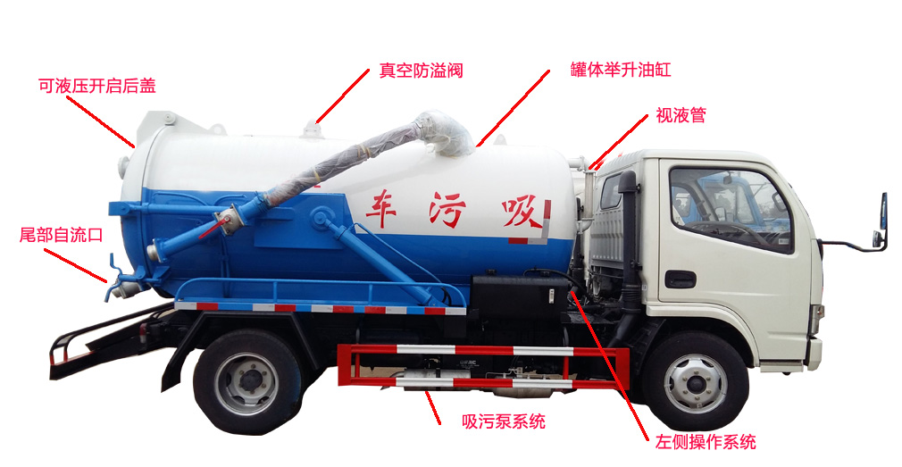 東風多利卡吸污車,配置朝柴156馬力發動機(玉柴150馬力發動機),國五排放標準,氣剎,帶方向助力,3800mm軸距。8.25鋼絲胎,帶ABS防抱死系統,帶大燈調節系統,剎車自動調節臂,防飛濺擋泥板,罐體有效容積7.8立方。配置SK-12水環式真空泵(或油式真空泵),進氣管加過濾網,防溢閥,加手油門線,罐體帶舉升自卸功能,后蓋帶液壓開啟功能。尾部配置150mm-200mm鋁合金球閥,帶洗手裝置,8-12米的吸污管2根,罐體內部做防銹處理,其它標配。污泥經吸糞膠管進入容罐。或者由于虹吸管接近罐底,空氣被不斷排入糞罐時,因其沒有出路而被壓縮,致使罐內壓力高于大氣壓力,糞液即在壓縮空氣的作用下,經虹吸管,吸糞膠管排出罐外。