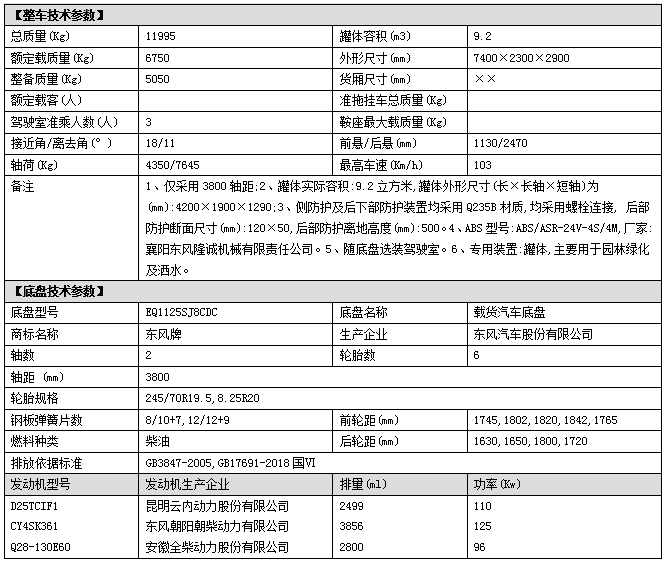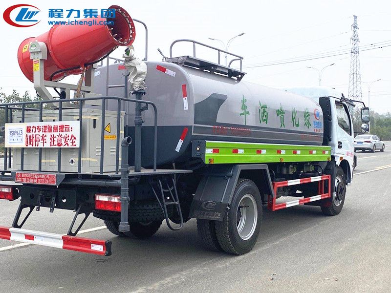 上裝配置:罐體容積:9.2立方,罐體鋼板采用Q235碳鋼鋼材,前沖后灑、側噴、平臺高炮、自流閥及消防接頭各1個、水管2根、標配大功率專用億豐泵或金龍泵,后平臺加裝30米、40米霧炮機組;其他標配。