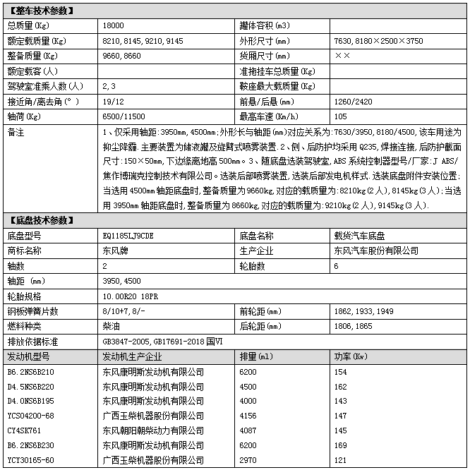 配置二:東風(fēng)D9多利卡系列駕駛室,4500mm軸距,康明斯230馬力(B6.2NS6B230)發(fā)動機,法士特8檔變速箱,10.00R20鋼絲胎,空調(diào)電動窗,ABS,斷氣剎,方向助力;