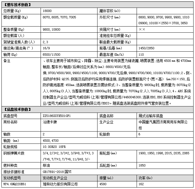 配置一:重汽汕德卡G5-M系列新款駕駛室,4700mm軸距,濰柴220馬力(WP4.6NQ220E61)發動機,國六排放,8檔變速箱,10.00R20鋼絲胎,氣囊座椅,可調節多功能方向盤,原裝自動空調,電動玻璃,ABS,斷氣剎,方向助力,中控鎖;